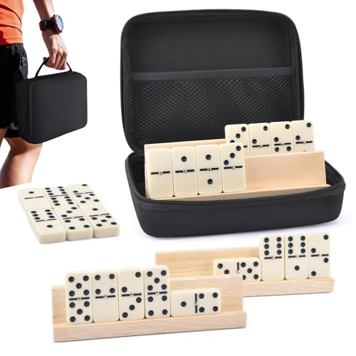 Dominos Set Adults with 4 Domino Racks Double Six Dominoes set in Portable Case Double 6 Domino's Game Set with 4 Wooden Domino Holders in EVA Hard Ca