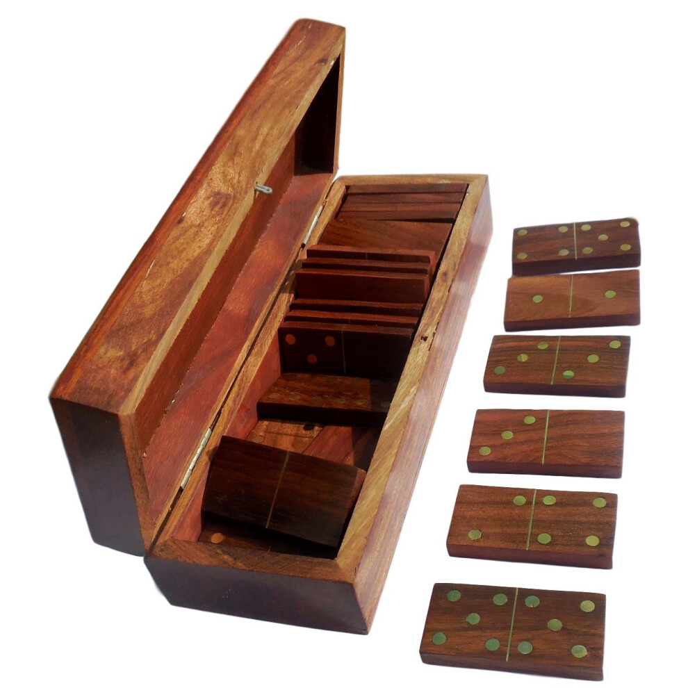 Thorness Handcrafted Wooden Domino Set with Brass Inlay, 28 Classic Tiles, 15cm x 10cm, Includes Wooden Storage Box – Elegant Table Game