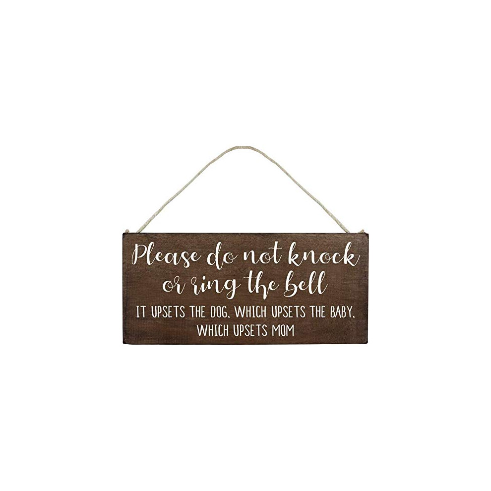 POWERMAZ Baby Sleeping Sign for Front Door - Funny No Soliciting 12x6inch Hanging Wood Plaque - Please Do Not Knock or Don't Ring Doorbell Dogs Will B