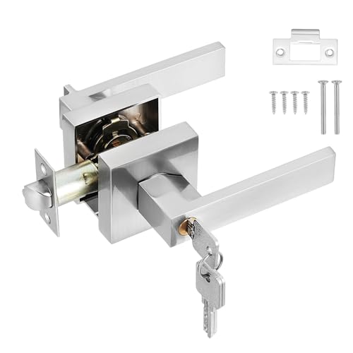 HSEAMALL Door Lever Handle Lock,Interior Door Handle with Lock and Key Square Entry Door Handle for Bedroom Office Left or Right Handing (Silver)