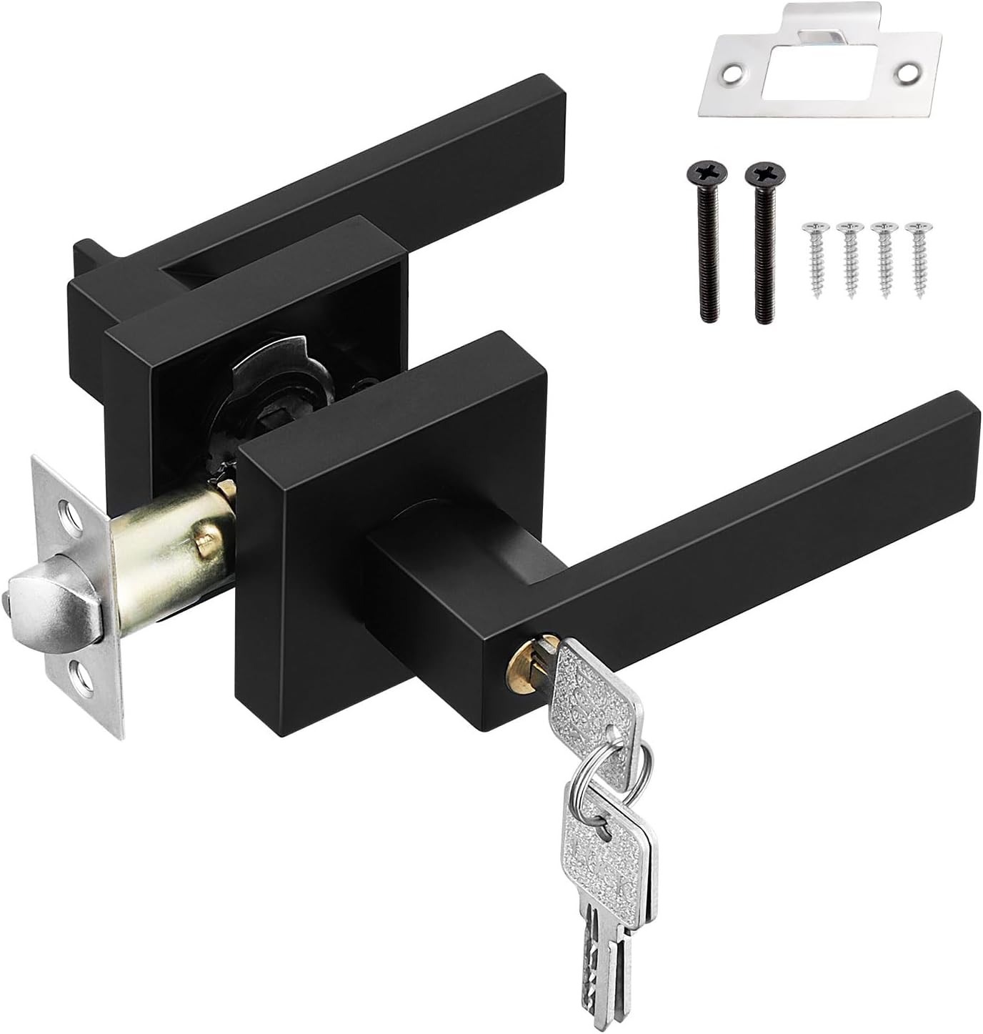 Door Lever Handle Lock,Black Interior Door Handle with Lock and Key Square Entr