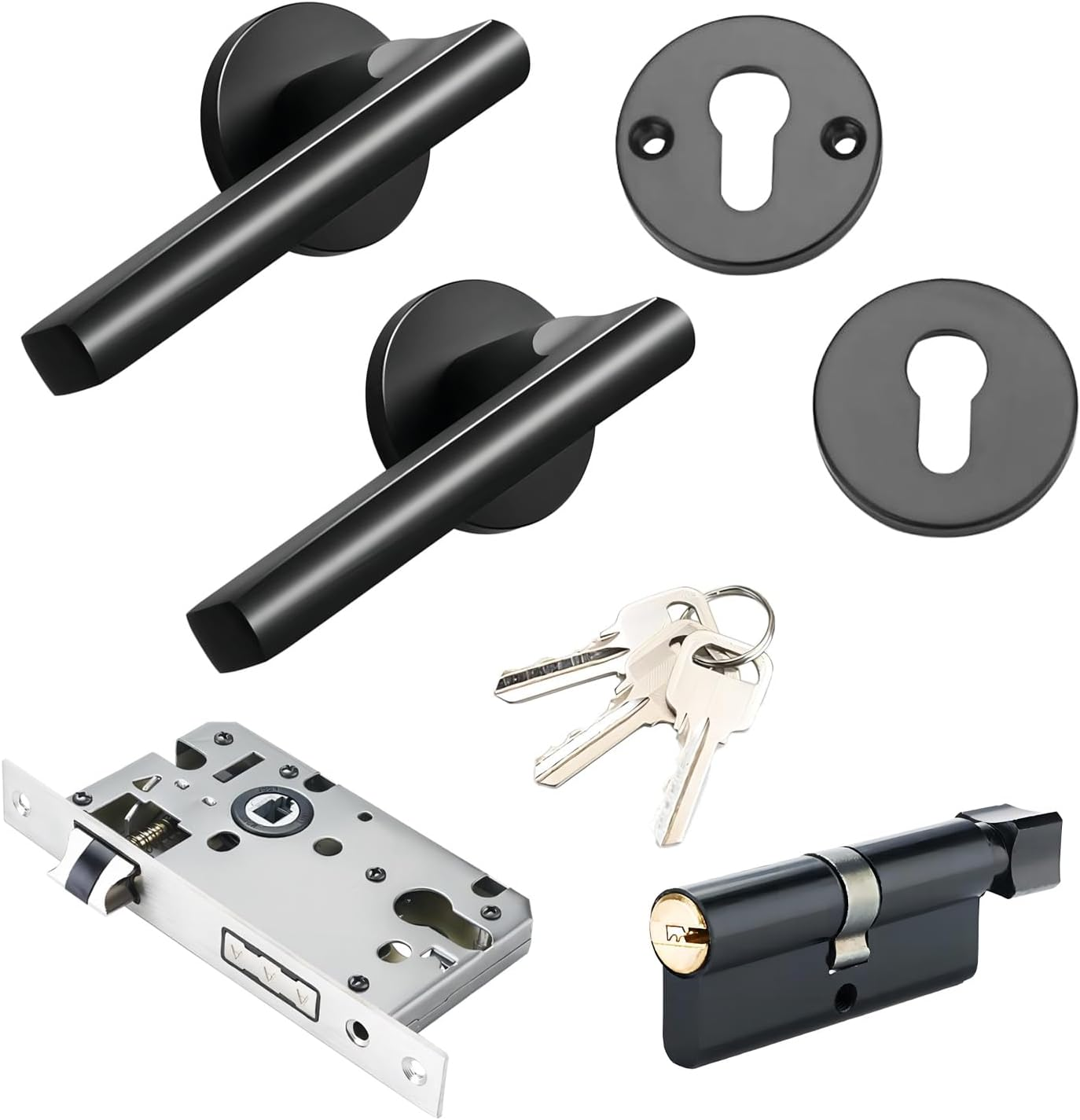 Bedroom Door Handle with Lock and Key, Anti-Theft Black Matte Split Lock, Intern