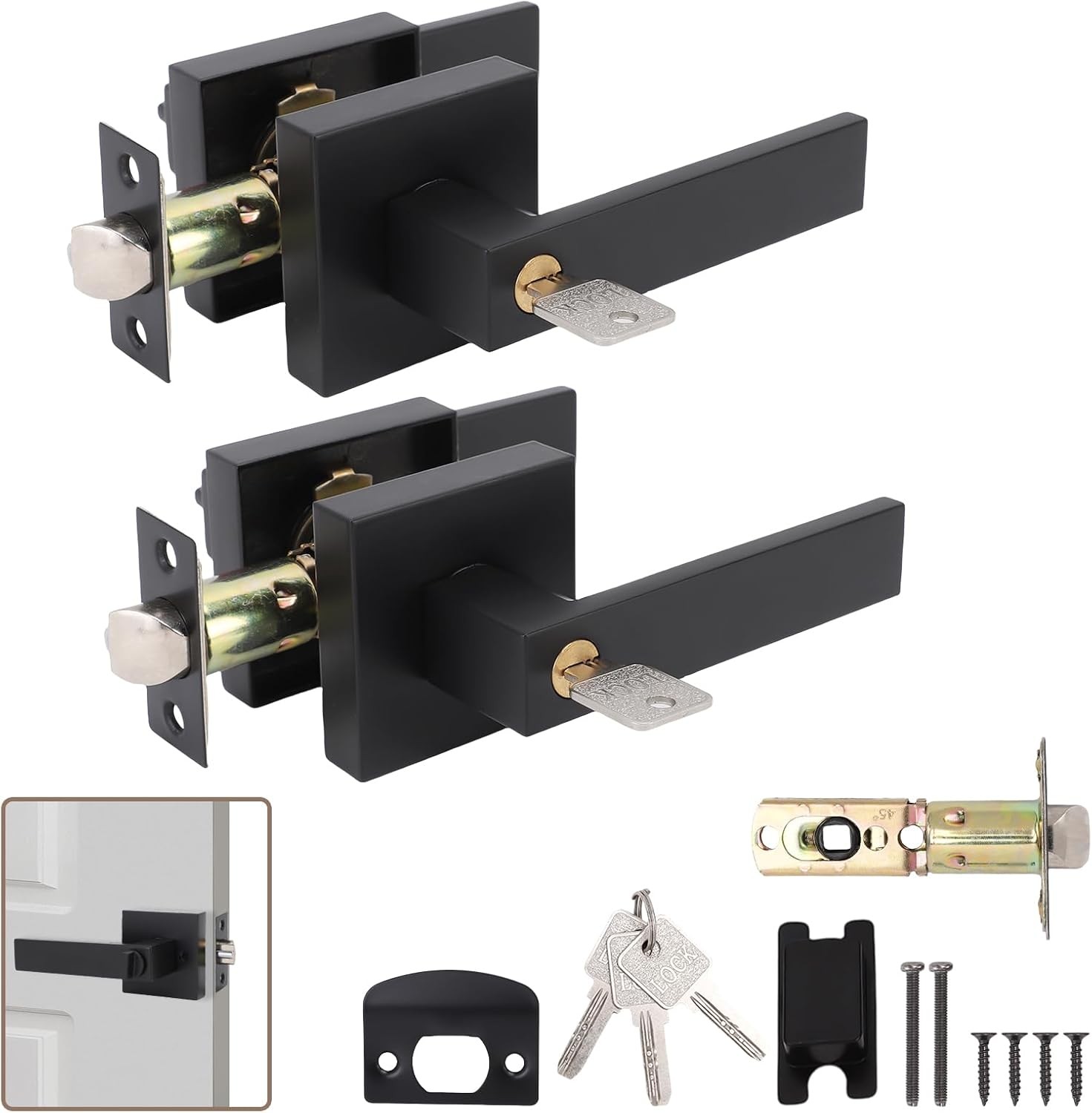 2 Pack Door Handle with Lock and Key, Interior Privacy Door Lever, Square Entry