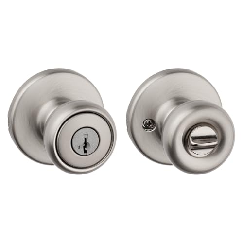 Kwikset Tylo Entry Door Knob with Lock and Key, Secure Keyed Handle Exterior, Front Entrance and Bedroom, Satin Nickel, Pick Resistant SmartKey Rekey Security and Microban