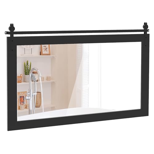 COSTWAY Decorative Rustic Wall Mirror, Rectangle Barn Door Hanging Vanity Mirror, Farmhouse Solid Wood Frame Wall Mounted Mirror for Bathroom, Living Room, Bedroom and Hallway (Black, 101x66cm)
