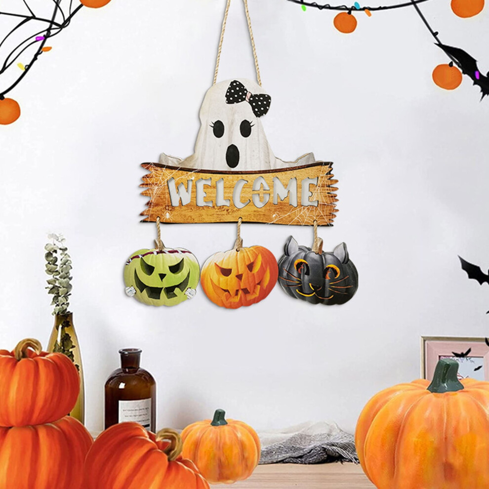 Halloween Welcome Door Sign, Cute Ghostly Pumpkin Rustic Wall Mounted Illuminated Door Signs, Fall Decorations for Home