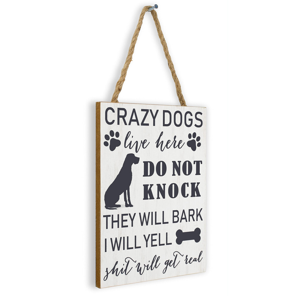 SANY DAYO HOME Crazy Dogs Live Here Do Not Knock They Will Bark I Will Yell Funny Dog Signs 11 x 8 inches Wood Plaque with Hanging Rope for Front Door