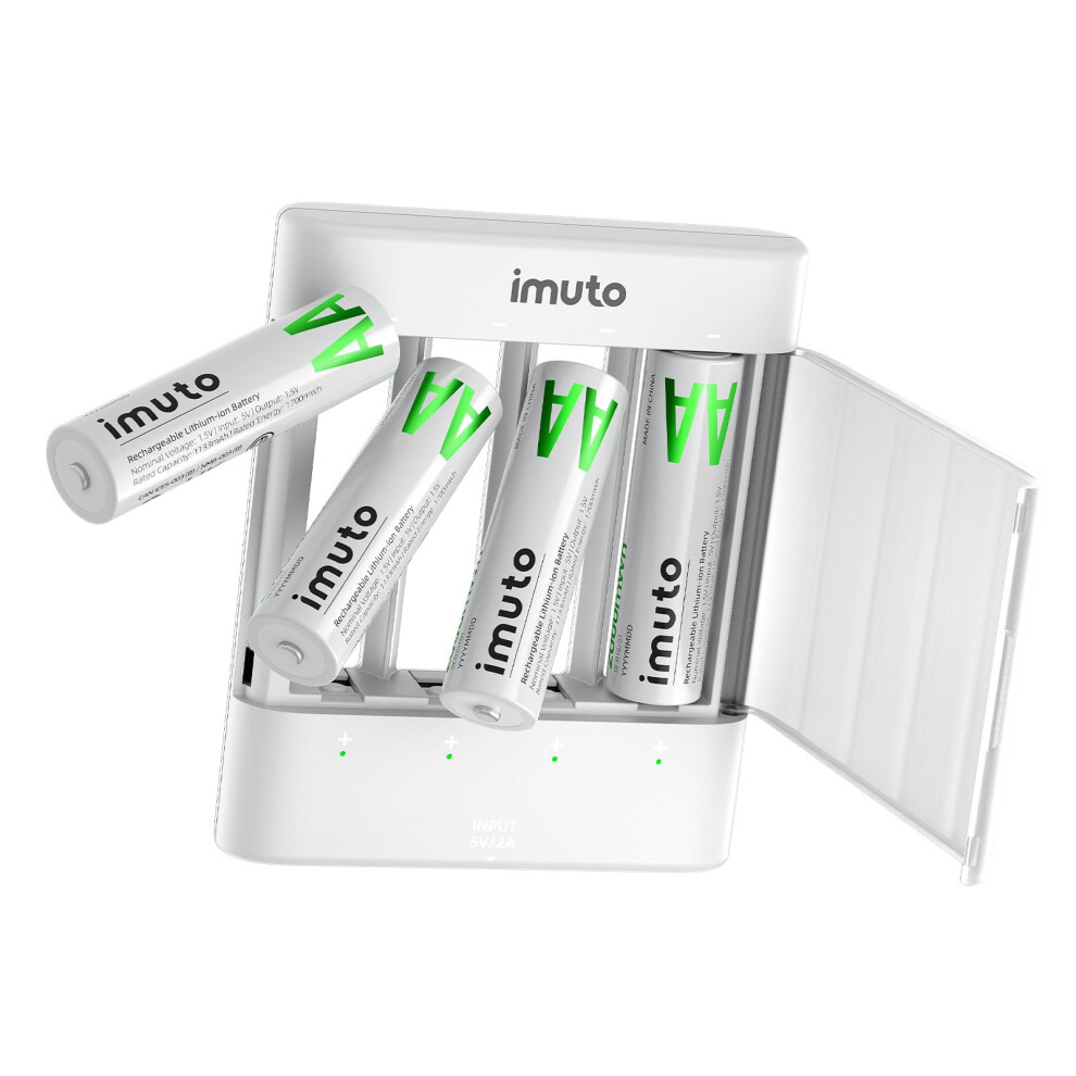 imuto Rechargeable Battery AA LiFePO4 4 Pack with Fast Charger, 2000 mWh High Capacity 1.5V Double A Batteries, 1600+ Cycles Long Lasting LiFePO4 AA Battery with ultra-thin charger
