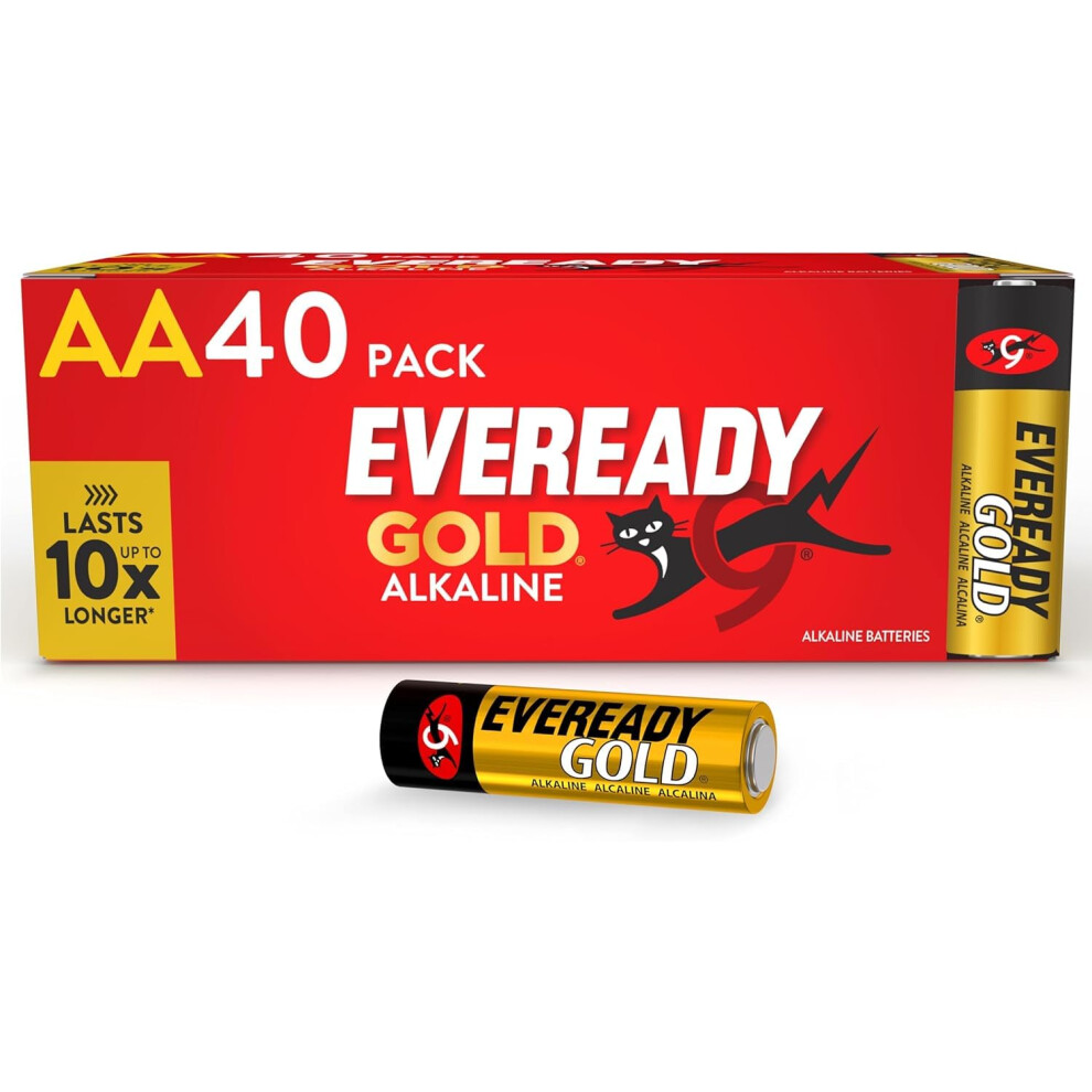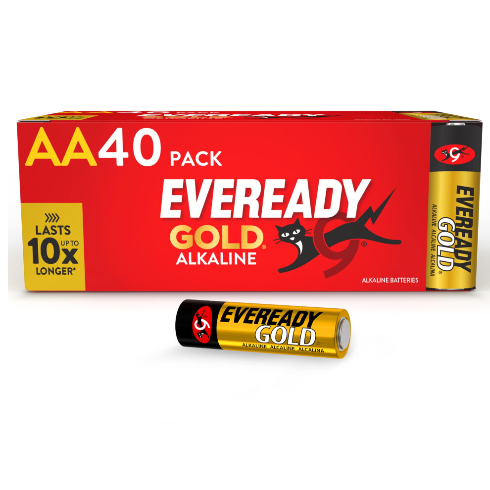 Eveready Gold by Energizer - AA Battery (40 Pack) - Bulk Double A Batteries - 1.5V Alkaline - Reliable Power For Every Day Devices - 100% Recyclable Plastic Free Packaging - 10 Year Shelf Life