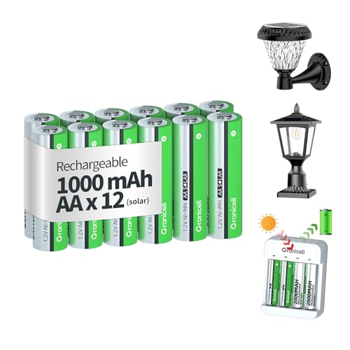 Granicell Rechargeable Batteries 12 PCS, 1.2V, 1000mAh AA Solar Batteries, Pre-Charged, High Capacity Double A Ni-MH Battery, Ideal for Solar Lights, String Lights and Household Equipment