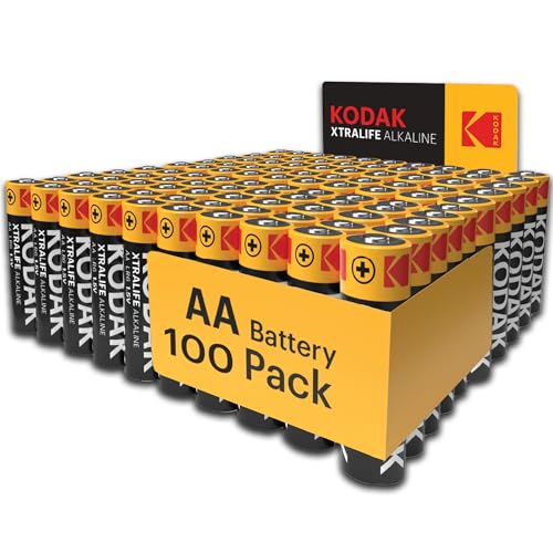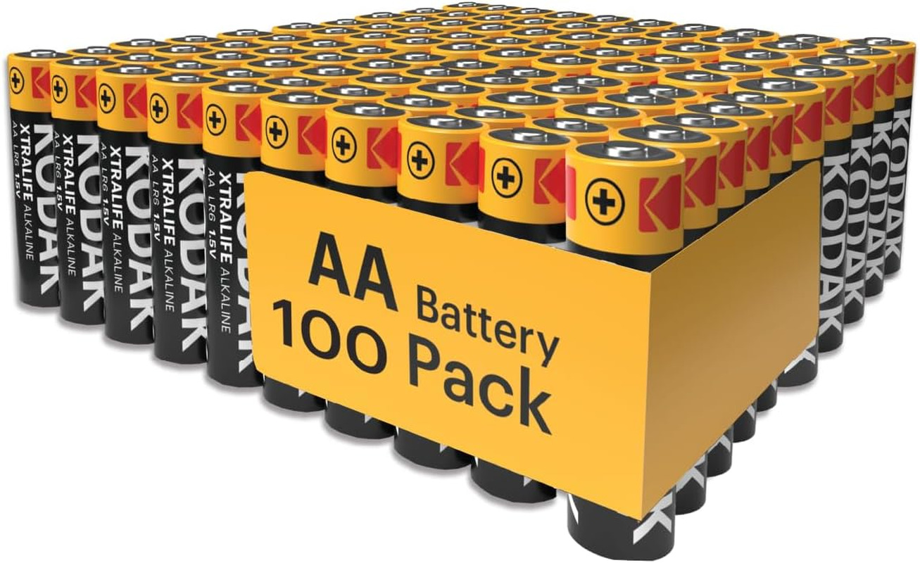Kodak Xtralife 100-Pack AA Batteries, Double A Alkaline Battery Pack, 1.5V, 10-Year Shelf Life, LR6, Bulk Value Pack for High-Usage, High-Drain Devices, 12x More Power