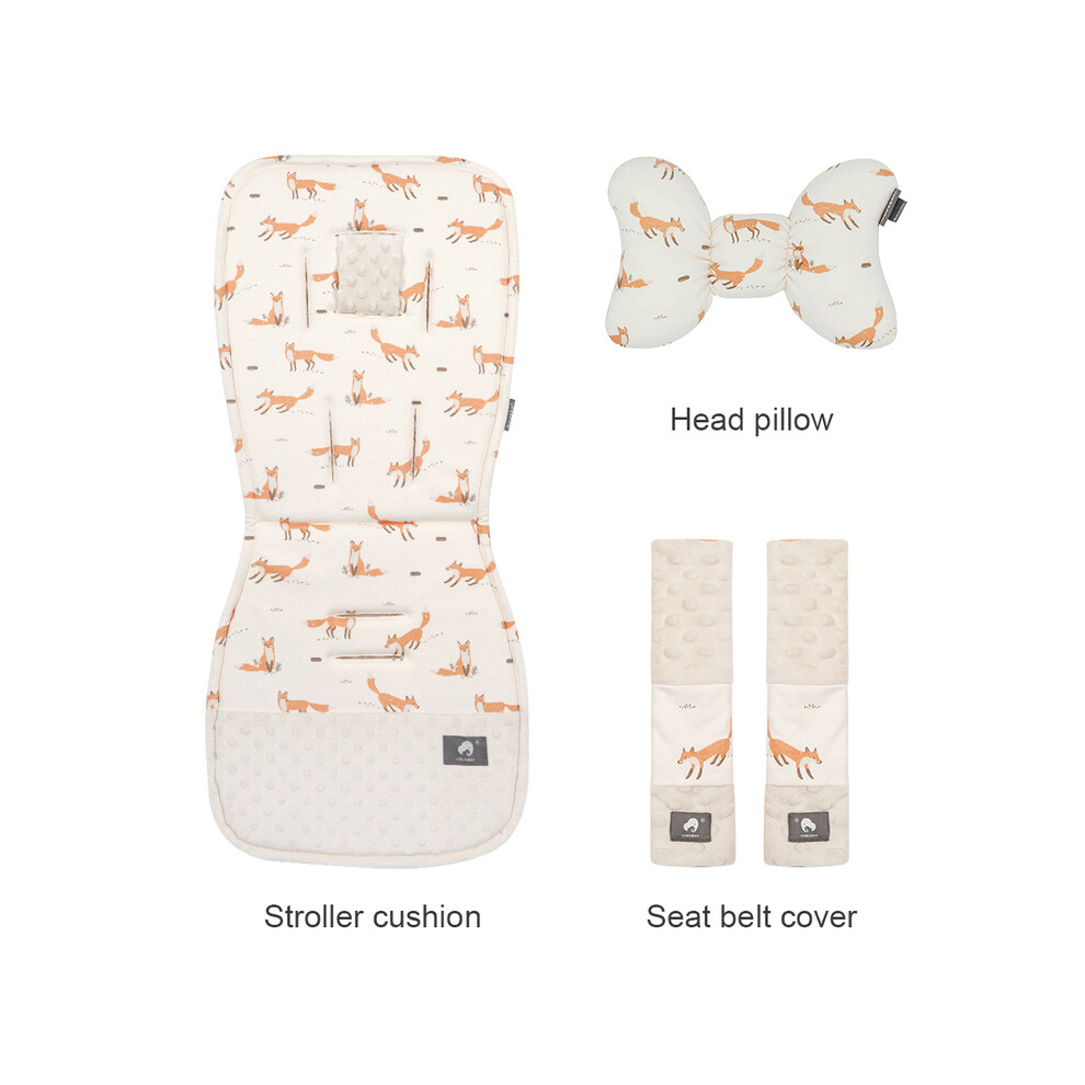 (fox) Stroller Cushion & Head Pillow & Seat Belt Cover 3Pcs/Set Universal Pram Pad Soft Cotton Double Sides Usable Baby Accessories