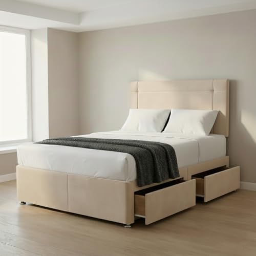 amu 4FT6 Double Bed with 4 Drawers | 24" Headboard, Plush Velvet Double Divan Bed for Space-Saving Solutions | Double Bed (Cream, 4FT6 Double - 4 Drawers)