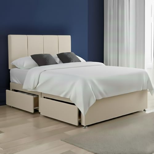 BSSPOKE Ella Divan Bed with Mattress Included Plush Velvet 24” Headboard 2 Storage Drawers Double Bed UK (Cream, 5ft King)