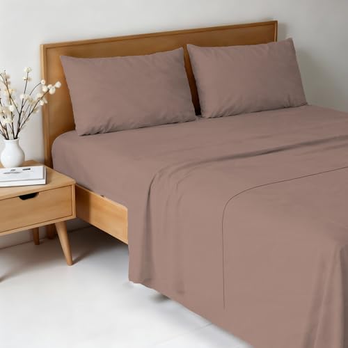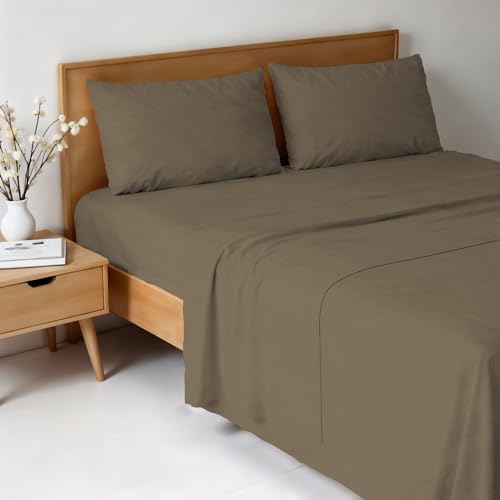 EXTRA DEEP FITTED BED SHEETS NON IRON LUXURY PERCALE COTTON RICH VALANCE FITTED SHEET PLEATED BRUSHED COTTON BEDDING DOUBLE BED SET FLAT SHEET (Single, Latte)