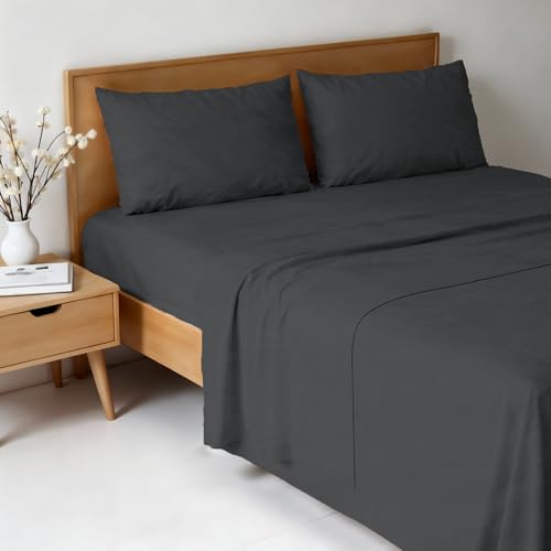 Double Bed Sheet Set, 100% Natural Cotton, Made in Italy – Complete Bed Set, Fitted Sheet, Top Sheet 240 x 300 cm and Pillowcases with Inner Flap, Dark Grey/Cream