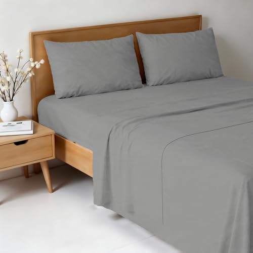 EXTRA DEEP FITTED BED SHEETS NON IRON LUXURY PERCALE COTTON RICH VALANCE FITTED SHEET PLEATED BRUSHED COTTON BEDDING DOUBLE BED SET FLAT SHEET (Single, Grey)