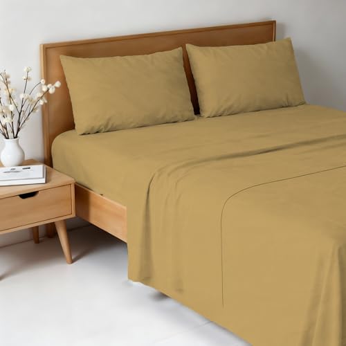 River Cotton Double Bed Sheet Set, Made in Italy – Complete Bed Set, Fitted Sheet, Top Sheet 240 x 300 cm and 2 Pillowcases with Inner Flap (Double, Rio Gold)