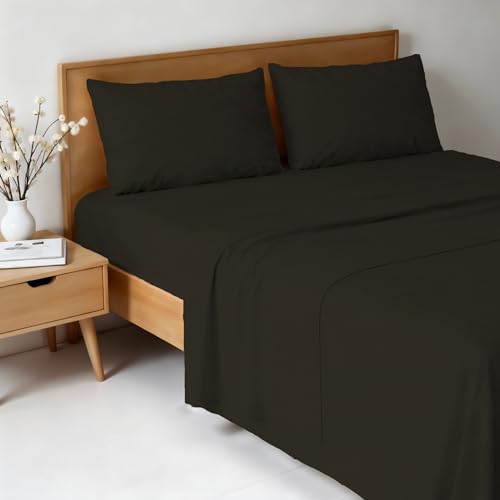 EXTRA DEEP FITTED BED SHEETS NON IRON LUXURY PERCALE COTTON RICH VALANCE FITTED SHEET PLEATED BRUSHED COTTON BEDDING DOUBLE BED SET FLAT SHEET (Single, Black)