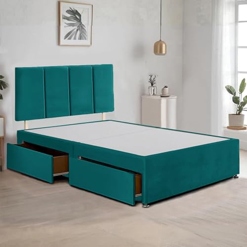 BED TIME UK - Emerald Green Plush Fabric Divan Bed Frame | Bed Base with 20” Vertical Line Headboard | 4FT Small Double Bed Frame with 2 Drawers