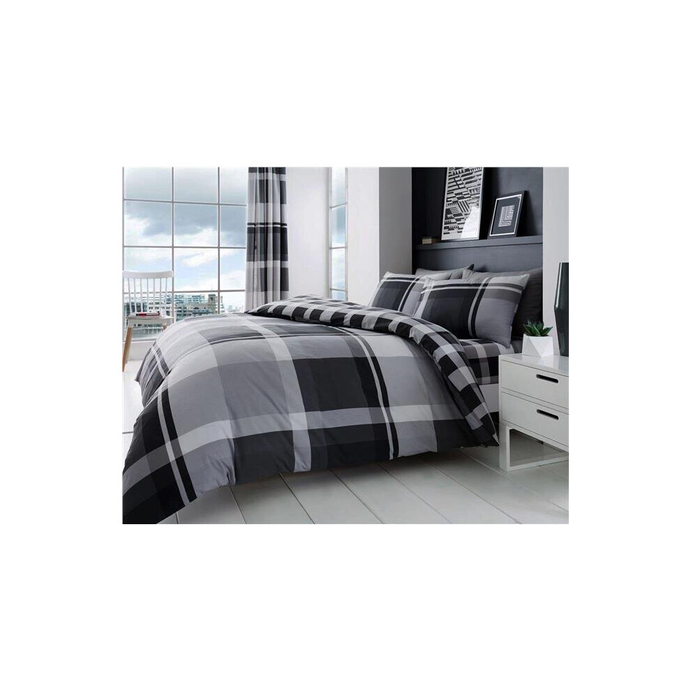 (Double) Grey bedding duvet set check quilt cover & pillow cases modern charcoal tartan
