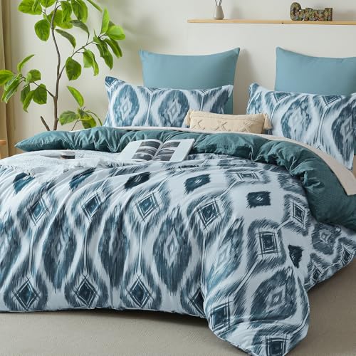 Boho Geometry Duvet Cover Set Double Bohemian Bedding Set for Boys Girls Adults Soft Reversible Gird Plaid Cube Duvet Cover with Zipper Closure (Blue, 200×200cm)