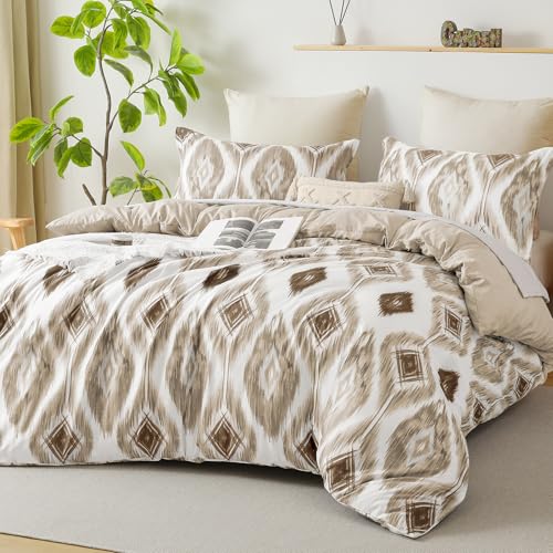 Boho Geometry Duvet Cover Set Double Bohemian Bedding Set for Boys Girls Adults Soft Reversible Gird Plaid Cube Duvet Cover with Zipper Closure (Brown, 200×200cm)