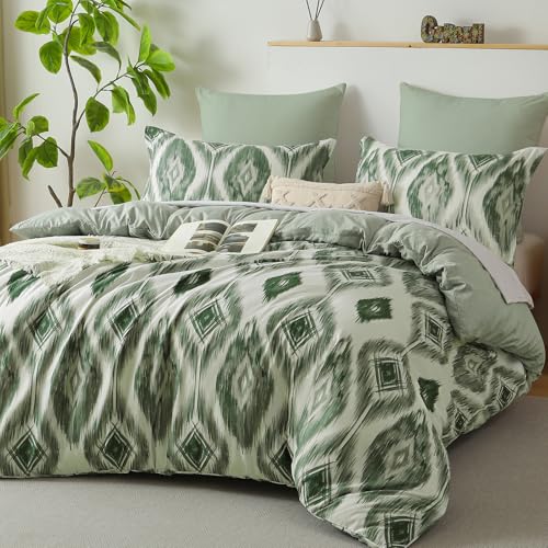 Boho Geometry Duvet Cover Set Double Bohemian Bedding Set for Boys Girls Adults Soft Reversible Gird Plaid Cube Duvet Cover with Zipper Closure (Green, 200×200cm)