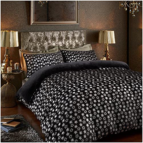 GC GAVENO CAVAILIA Teddy Fleece Star Foil Fitted Sheet, Super Soft Fluffy Cosy Warm Shiny Bedding & Bedsheet, 2 Piece Easy Care DuvetCover & Deep Elastic Band Bedlinen, Black, Double Duvet Set