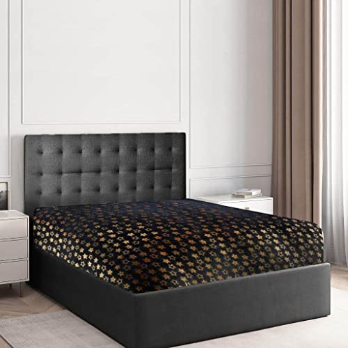GC GAVENO CAVAILIA Teddy Fleece Star Foil Duvet Set, Super Soft Fluffy Cosy Warm Shiny Bedding & Bedsheet, 2 Piece Easy Care DuvetCover & Deep Elastic Band Bedlinen, Black, Double Fitted Sheet
