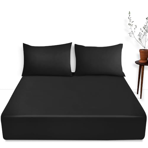 (Black Pillowcase Only) Plain Fitted Sheet Black Single Double King Size Bedsheet 25cm Deep UK