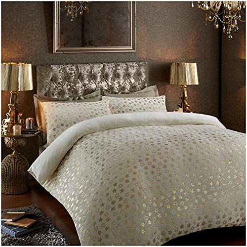 GC GAVENO CAVAILIA Teddy Fleece Star Foil Duvet Set, Super Soft Fluffy Cosy Warm Shiny Bedding & Bedsheet, 2 Piece Easy Care DuvetCover & Deep Elastic Band Bedlinen, Cream, Double Fitted Sheet
