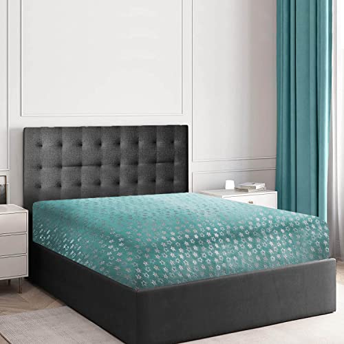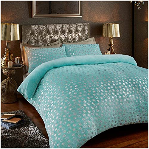GC GAVENO CAVAILIA Teddy Fleece Star Foil Duvet Set, Super Soft Fluffy Cosy Warm Shiny Bedding & Bedsheet, 2 Piece Easy Care DuvetCover & Deep Elastic Band Bedlinen, Aqua, Double Fitted Sheet
