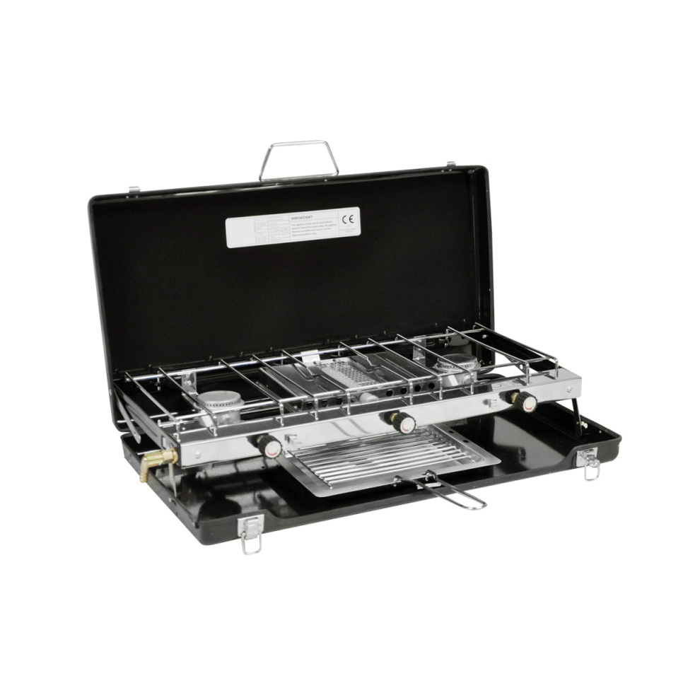 New Chef Folding Double Burner Stove and Grill, compact gas cooker for camping