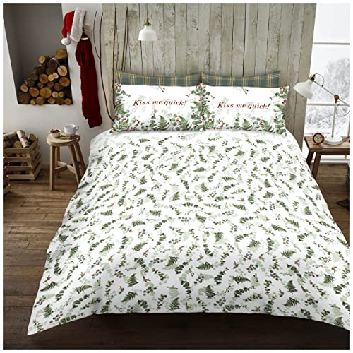 Dreams & Drapes Christmas Duvet Cover – Holly & Red Berry Print – Double Size 200 x 200cm – 100% Cotton – Reversible Festive Bedding – Winter Sprigs & Fern Design