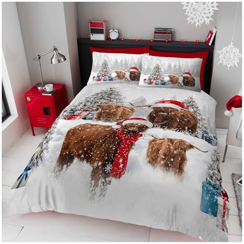 GC GAVENO CAVAILIA Xmas Highland Cow Duvet Cover - Festive Christmas Double Bedding Set with Pillowcases - Soft Hypoallergenic Polyester Quilt Cover Bed Set (200x200 cm) - Easy Care Winter Bed Linen
