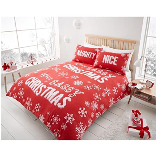 Fusion - Christmas Phrases Duvet Cover - Double Bedding Size (200 x 200cm) - Reversible (2 Designs) - 2x Pillowcases Included - Snowflakes Duvet Cover - Christmas Bedding in Red & White - Xmas Decor