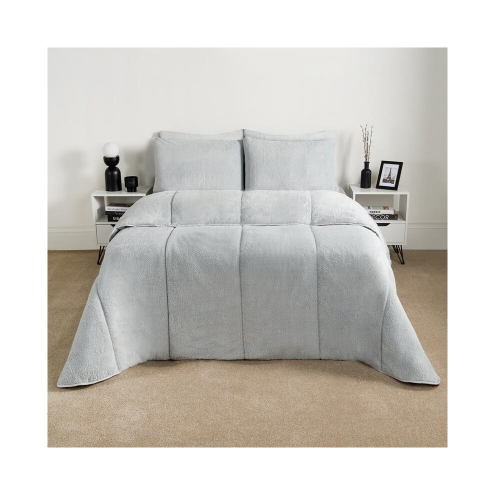 (Teddy Silver, Double) OHS Coverless Quilted Duvet with Pillowcase Set Soft Fleece Teddy Sherpa Cable Knit 7.5/10.5 TOG All Year Round Summer Winter C