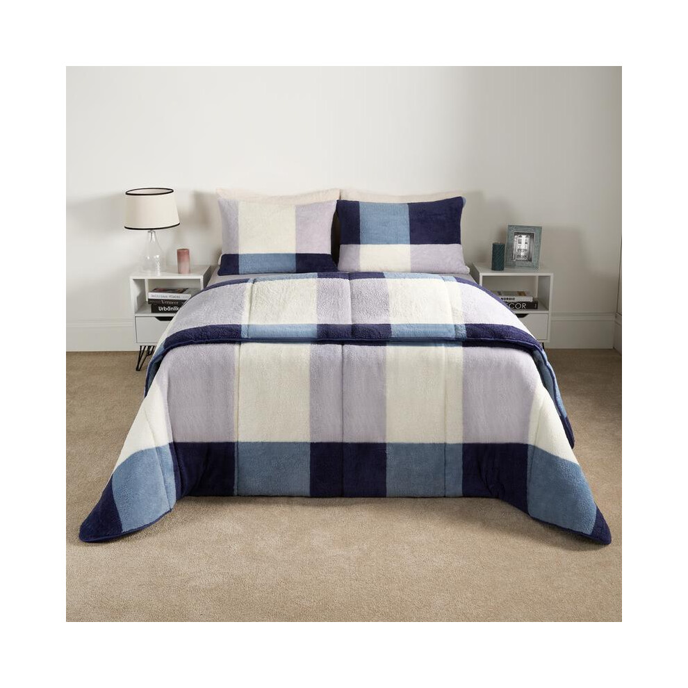 (Teddy Gingham Navy, Double) OHS Coverless Quilted Duvet with Pillowcase Set Soft Fleece Teddy Sherpa Cable Knit 7.5/10.5 TOG All Year Round Summer Wi
