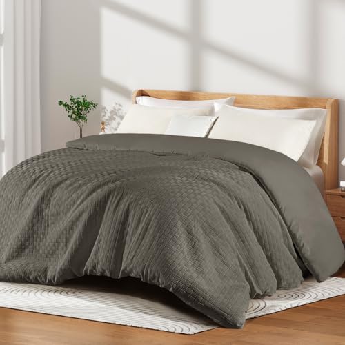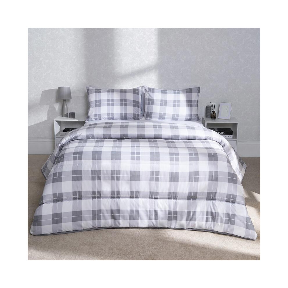 OHS Coverless Double Duvet 10.5 Tog, Soft Warm Microfibre Fabric Timeless Gingham Design Double Duvet Comfortable For All Season Washable Bedding Set & 2 Pillowcases, Grey