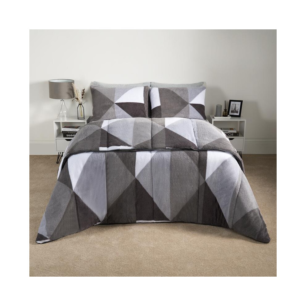 OHS Teddy Fleece 10.5 Coverless Double Duvet, Reversible Duvet Double Washable Coverless Travel Camping Soft Warm Comfy Bed Set with Pillowcases, Grey Geo