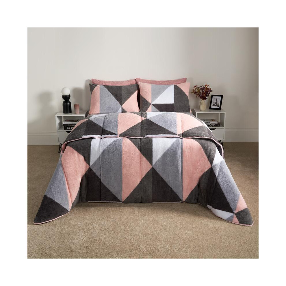 OHS Teddy Coverless Quilt Double 10.5 Tog, Reversible Fleece Duvet Double Washable Coverless Duvet Camping Winter Soft Warm Comfy Bedding with Pillowcases, Pink Geo