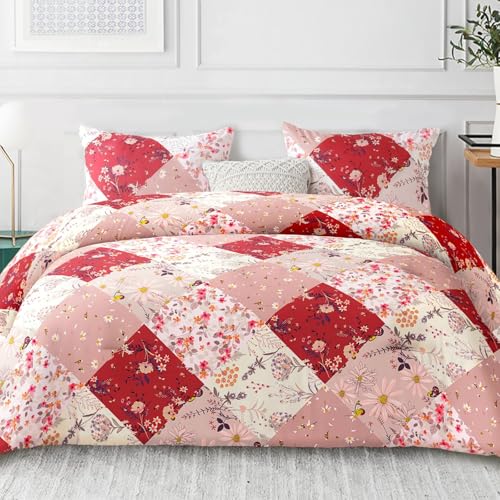 Whale Flotilla Coverless Double Duvet Set, Patchwork Floral Printed Breathable Queen Comforter Ultra Soft Polyester Reversible Bedding Set with 2 Pillow Shams for winter, 200×200CM, Red