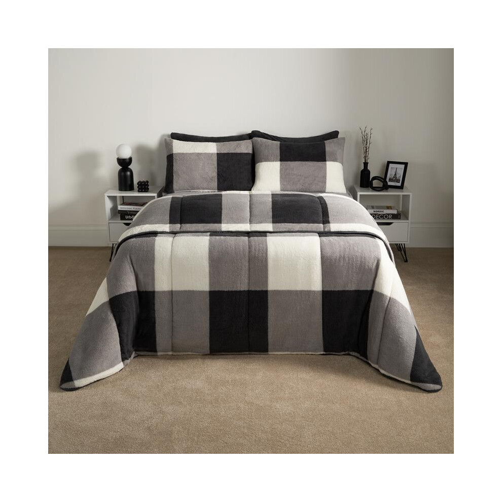 OHS Gingham Teddy Fleece 10.5 Tog Coverless Double Duvet, Soft Warm Duvet Double Washable Coverless Travel Camping Comfy Bed Set with Pillowcases - Grey