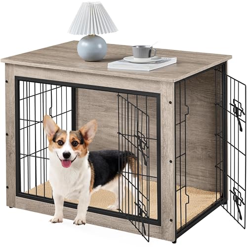 Yaheetech Dog Crate Furniture Dog Cage End Table Wooden Puppy House with Double Doors & Anti-skid Plush Mat for Puppies/Small-sized Animals, Indoor Pet Kennel Side Table, Gray