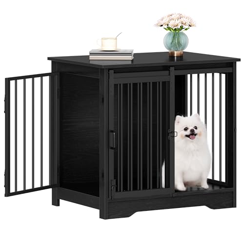 Hzuaneri Dog Crate Furniture, 69 cm Double Door Wooden Dog Crate with Barn Door, Indoor Kennel, End Side Table Wooden Animal Crates for Small Dogs, Anti-Chew Anti-Escape, Black DFC84304B