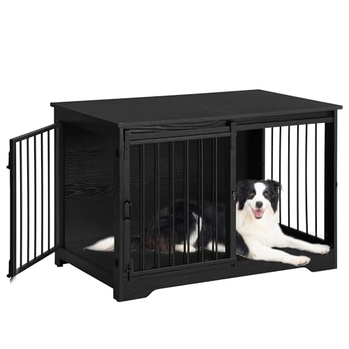 Hzuaneri Dog Crate Furniture, 100 cm Double Door Wooden Dog Crate with Barn Door, Indoor Kennel, End Side Table Wooden Animal Crates for Small Medium Large Dogs, Anti-Chew Anti-Escape, Black DFC02304B