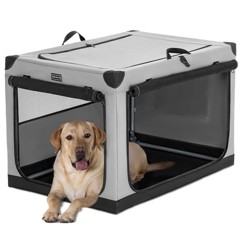 Petsfit Soft Sided Dog Crate,Large dog Crate Double Dog Crate, Cat Cages Indoor 3 Door Design Portable Dog Crates 91 cm L x 61 cm W x 59 cm H Grey