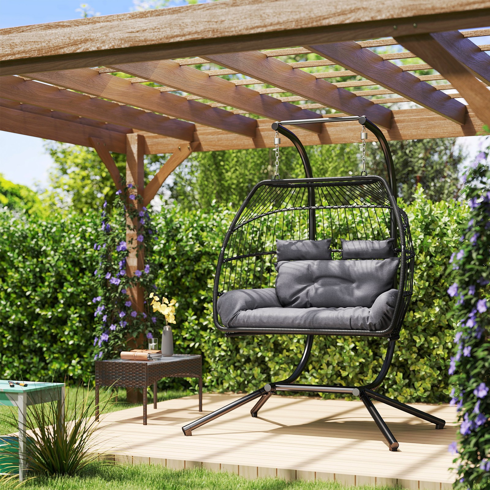 Double Hanging Chair Wicker Swing Egg Foldable Steel Frame with Stand Dark Grey