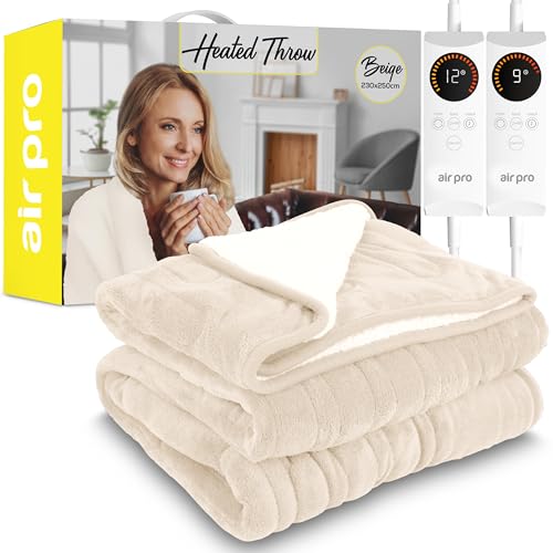 Air Pro Heated Throw - Dual Control Electric Blanket - Digital Controller - Timer up to 9 hours, 6 Heat Settings, Auto Shutoff - Machine Washable - King Size 230x250cm - Grey Shearling